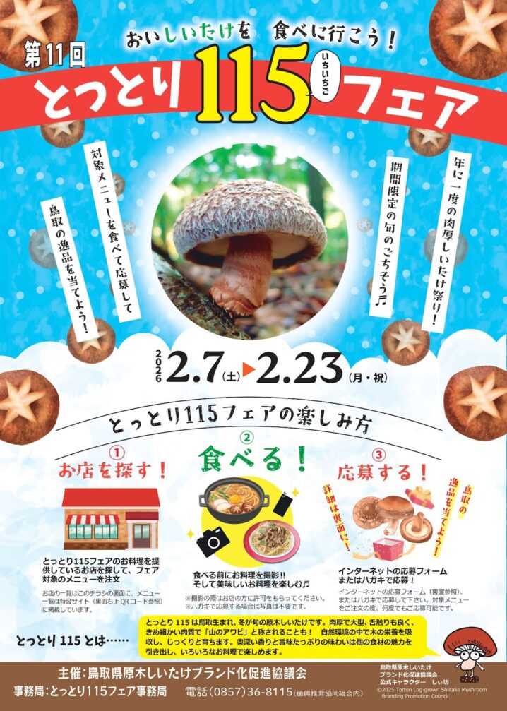 おでかけ・観光2026-02-01「とっとり115フェア」が2026年2月7日~2月23日まで開催!肉厚原木しいたけを食べて楽しむお料理フェア